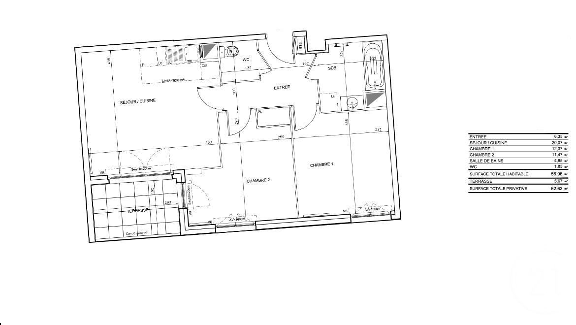 - Surface totale : 62,6 m2